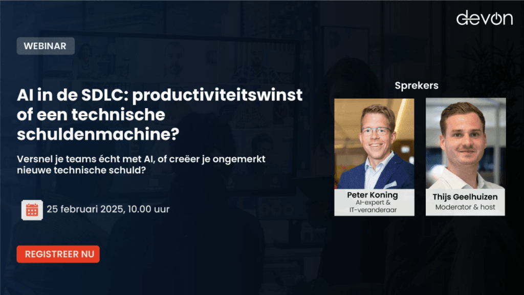 In dit interactieve webinar gaat Thijs Geelhuizen in gesprek met Peter Koning over de realiteit van AI in de SDLC. Geen hype, maar eerlijke praktijkverhalen.